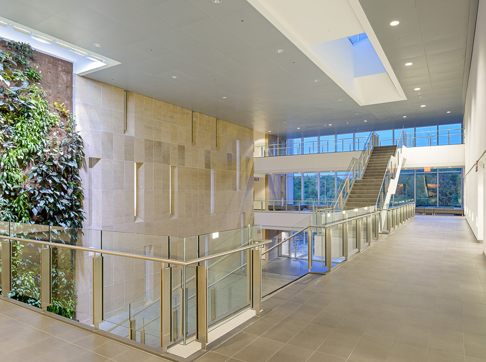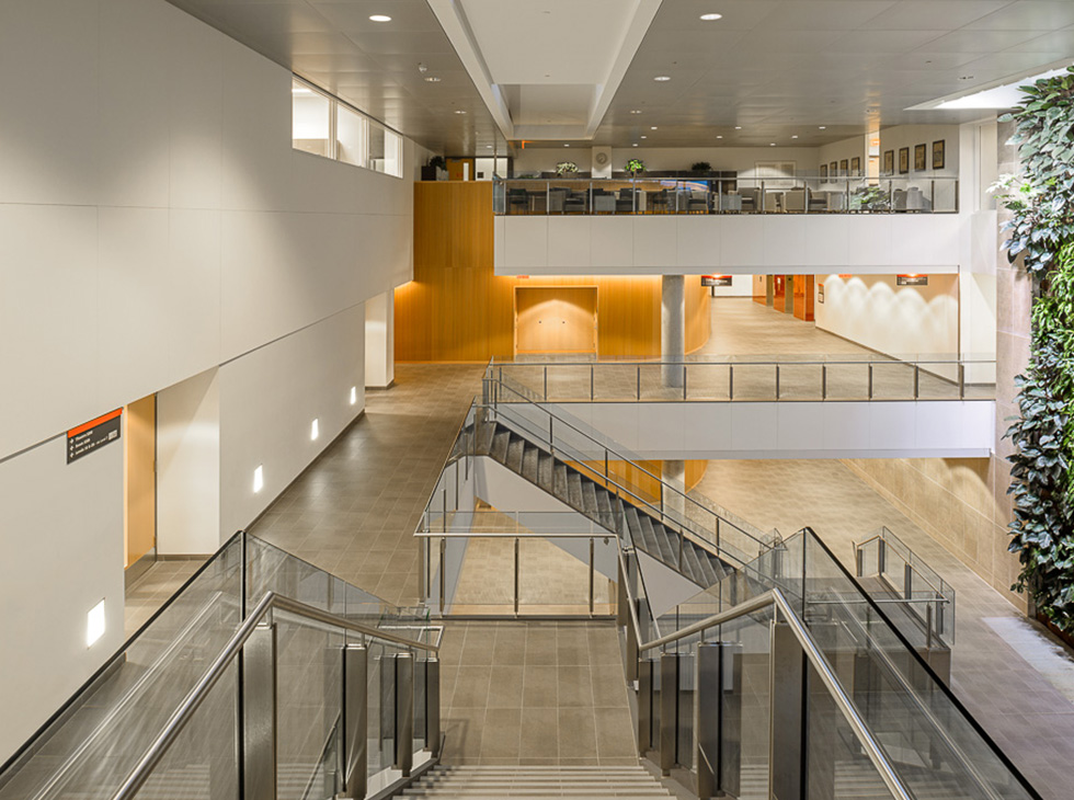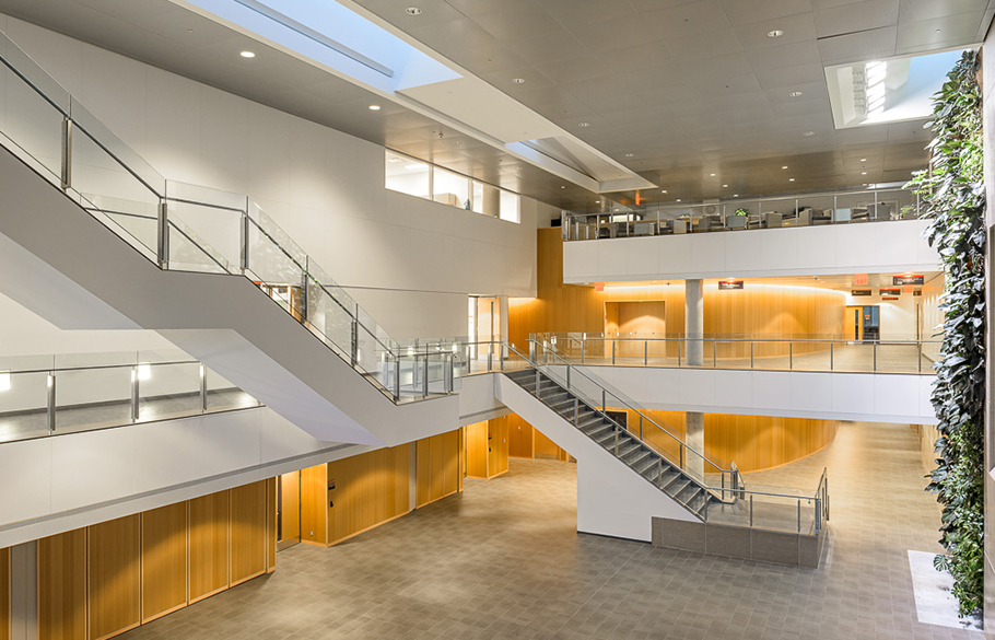 Crossey Engineering provided mechanical, electrical, and lighting design for this project that includes a three-storey atrium, open-air patio, and bio wall to increase sustainability.